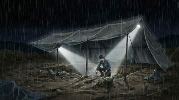动漫风格,中景,林牧蹲在玉琮旁抬头看向右侧,右侧齐教授(60+岁,花白头发,戴老花镜,穿深色考古服)正走过来,林牧、齐教授和环境背景图分别识别参考图1、图2、图3,注意林牧蹲在玉琮旁的位置。