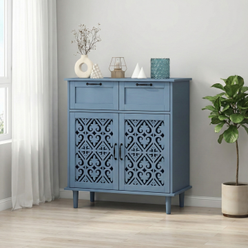 请根据图中蓝色柜子给柜子换一个背景图,把柜子下面的门打开,里面发一些厨房用品,抽屉不变 不用打开