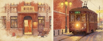 把图片一,地面上的“大连東闗街”这个元素及倒影,挪动到图片二中,保持和建筑物的位置大致不变,融合自然,且不改变图片二其他的画面元素