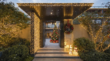 傍晚蓝调时刻,五星级酒店外观全景,现代简约风格建筑,主体为高耸的深棕色玻璃幕墙大楼,顶部和底层裙楼有温暖的金黄色LED灯带勾勒轮廓,大量均匀分布的亮灯窗户,前方平静水面倒映着建筑灯光,形成对称的金色光斑涟漪,水边种植整齐的绿树和低矮灌木,底层露台有排列整齐的棕色遮阳伞和桌椅,背景是渐变的深蓝色天空和远处的辅助建筑,整体光影柔和,营造出高端、宁静、奢华的氛围,专业摄影级画质,清晰锐利的细节,完美的对称构图,温暖与冷色调对比和谐。