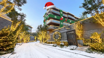 高端酒店外观夜景,现代简约建筑风格,主体为高耸的米灰色玻璃幕墙大楼,顶部及裙楼边缘有温暖的金黄色灯带勾勒轮廓,大量明亮的窗户透出内部灯光。建筑前方有平静的水池,完美倒映出建筑的灯光与轮廓,水面泛着金色涟漪。周围点缀着茂密的绿色树木,底层设有带遮阳伞的露天休息区。天空呈现深邃的蓝紫色渐变色,营造出宁静、奢华、大气的氛围,专业摄影级画质,清晰的细节和光影层次,高分辨率。