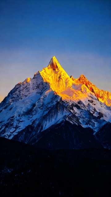 壮丽的雪山全景摄影,雄伟的山峰群在清澈的深蓝色天空下巍峨耸立,山顶覆盖着洁白厚实的积雪,山体岩石呈现出深褐色与灰色的自然纹理,阳光从侧上方照射,在山峰表面形成明亮的高光与深邃的阴影对比,勾勒出尖锐的山脊和陡峭的岩壁轮廓,几朵形态轻盈的白云点缀在山峰之间的蓝天中,近处的山峦呈现出温暖的棕黄色调,整体画面气势恢宏、细节丰富,具有极高的写实感和自然光影层次,营造出宁静而壮阔的高山氛围。