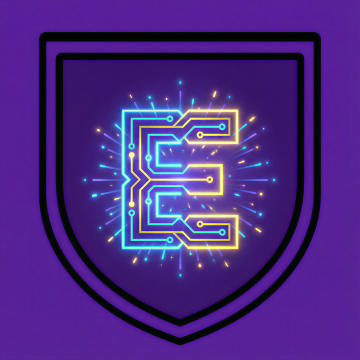 一个具有未来主义赛博朋克风格的圆形图标,中心是尖锐的白色闪电符号,主体采用深紫色与亮蓝色的霓虹渐变填充,边缘有强烈的辉光效果和电路纹理环绕,整体呈现出科技感十足的半透明玻璃态材质,背景为黑色,带有细微的网格和数据流效果,图标具有明显的金属边框和立体感,光影对比强烈,闪电符号带有动态的电流脉冲视觉效果。