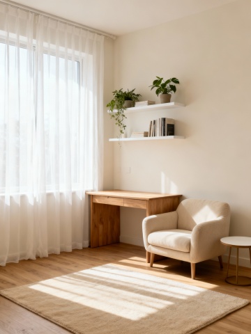 极简主义室内背景,画面中央是一块巨大的圆形米白色地毯特写,地毯表面有细腻的纹理质感,边缘有精致的收边设计。房间整体采用米白色和浅棕色的柔和色调,左侧是大面积的落地窗,挂着两层窗帘,内层是轻薄透光的白色纱帘,外层是厚实的浅棕色亚麻质感落地窗帘,窗帘自然垂坠,有明显的褶皱纹理。右侧墙角立着一盏现代简约风格的落地灯,灯罩是圆形的乳白色磨砂玻璃,金属灯杆纤细,底座为圆形,灯光柔和地照亮墙角,在墙壁上形成温暖的光晕。阳光透过纱帘洒入室内,在地板和地毯上投下窗格的阴影和窗帘的光影,整个空间光线明亮柔和,氛围宁静、舒适、整洁,具有高级的现代简约设计感,空间布局开阔,留白充足,视觉层次清晰,突出地毯的主体地位。