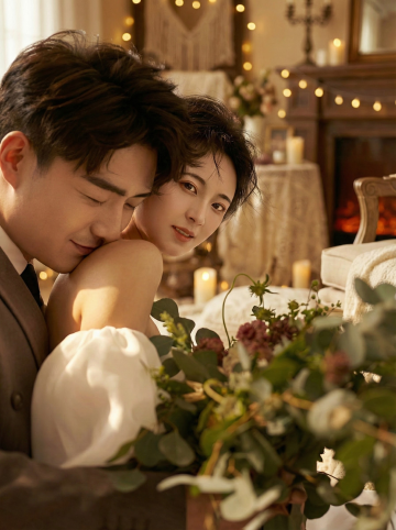 复古质感婚纱照,木质背景与自然光效交织,营造温暖柔和的视觉氛围,细腻呈现浪漫唯美的情感表达,光影流动中尽显优雅静谧的中式文艺格调。