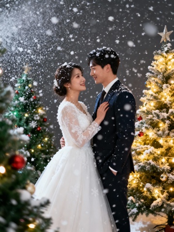 男生在左身穿正装,女生在右穿着婚纱,女生挽着男神胳膊,两人对着镜头微笑,半身正面照,背景是城市灯火,大光圈虚化