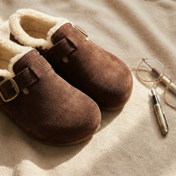 上脚场景图(氛围感) 视觉布局:模特半身或小腿以下出镜,穿着简约的米色/灰色系棉麻长裤或直筒裤,赤脚穿鞋。场景为图书馆木质阶梯的一角、安静咖啡馆的椅子边,或家中浅色系地毯上。鞋子是视觉焦点,占比约50%。 氛围:模特姿态放松,画面留有呼吸感,强调“舒适”与“静好”的穿着状态。