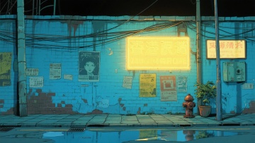 港风二次元,黑夜下雨城市,,细节丰富,蓝色为主、黄色为辅,生成2张,不要人,4k,16:9