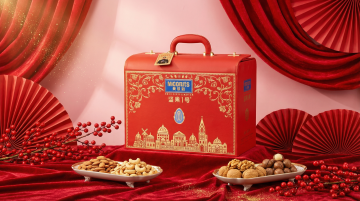 国潮风坚果礼盒,拟人化笑脸由坚果拼成,浮雕云纹点缀,喜庆红金配色,中式元素与现代创意融合,节日氛围浓厚。