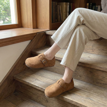 场景:浅木色书架前,鞋子自然置于地面,搭配一条米色阔腿裤与浅灰棉袜(仅露脚踝部分)。 氛围:书架背景虚化,可见书籍标题与陶瓷杯柄。 文案:左侧竖排小字「安静陪伴你的阅读与行走」。