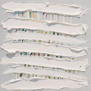 一幅抽象表现主义风格的油画,画面以厚重的绿色和白色笔触为主,笔触粗犷有力,带有明显的颜料堆叠感和肌理变化。上半部分是深浅不一的绿色色块,呈现出朦胧的云雾效果;下半部分则是白色与浅绿色交织的横向笔触,如同平静水面上的光影反射。整体色调清新自然,构图简洁大方,给人一种宁静而富有生机的感觉。画面中没有明显的具象物体,完全依靠色彩和笔触的变化来营造氛围。