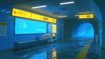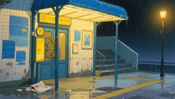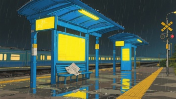 港风二次元,黑夜下雨街道,,安点,细节丰富,蓝色为主、黄色为辅,生成2张,不要人,4k,16:9