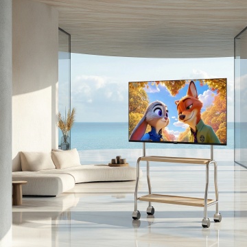 一个现代简约风格的客厅场景,阳光透过巨大的落地窗洒入,木地板泛着温暖的光泽,浅灰色的布艺单人沙发搭配黑色皮质脚凳,原木色的电视柜上放置着一台超薄智能电视,电视屏幕上显示着一个宁静的湖泊日落景色,湖面上有一艘小船,远处是连绵的山峦和橙红色的晚霞,天空中飘着几朵云彩,电视下方的应用图标清晰可见,电视柜上摆放着两个简约的黑色陶瓷花瓶,窗外可以看到城市的远景和山脉轮廓,整体氛围明亮、通透、舒适,具有高度的真实感和细腻的光影表现,光线从画面右侧窗户射入,在地面和家具上形成柔和的阴影和高光,色彩以原木色、灰色、白色为主调,搭配屏幕上日落的暖色调,构成和谐统一的现代家居美感。