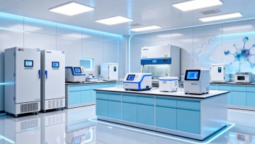 超写实风格的现代实验室场景,以蓝色和白色为主色调,光线明亮柔和,采用高清晰度的摄影质感,画面干净规整,适合做背景。实验室内部有身着白色防护服的研究人员正在操作先进的精密仪器,仪器外观呈白色和蓝色,带有显示屏和控制面板。背景是由白色方块和灰色方块组成的墙面,地面为浅色,整体环境整洁有序,设备排列整齐,空间感开阔,营造出专业、严谨、科技感十足的氛围,无任何文字、LOGO、二维码及冗余信息,视觉焦点清晰,细节丰富,适合作为科技、医疗、研究相关的背景使用。