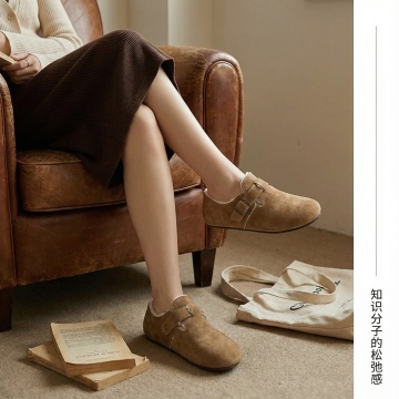 布局: 纯浅米色或浅灰色肌理背景。一双勃肯鞋 呈45度角摆放,占据画面约60% 的面积。 元素: 鞋子一侧,极其克制地放置一副细金边眼镜和一本摊开的米白色封面精装书(书名隐去或为外文),书本只露出一角。另一侧留出大量呼吸空间。 文案: 仅在画面右上角或左下角空白处,用纤细、优雅的非衬线字体写下 “步履间的沉思” 或 “舒适智学” 字样,字号小,颜色为深灰色。 焦点: 100%聚焦于鞋子的造型和牛反绒的细腻质感,道具仅用于氛围点缀,绝不喧宾夺主。