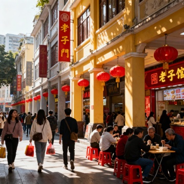 三街两巷古街区,青砖黛瓦的骑楼建筑错落有致,红灯笼高挂,传统手工艺店铺内匠人专注雕刻,游人穿梭其间,感受历史韵味。