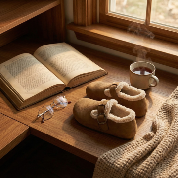 拟人风毛线杯套包裹热咖啡杯,雪花纹针织面料营造温馨可爱氛围,暖阳洒落木质桌面,传递冬日趣味与节日温情。