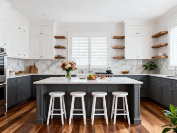 现代美式风格的厨房,整体色调清新柔和,布局实用又美观:露出白色平坦天花板 配色:以 “白色 + 深灰” 为主,白色吊柜 + 深灰地柜 / 中岛形成经典撞色,搭配深浅原木色木地板,简洁又有层次。 布局:设独立长方形中岛(带 4个白色高脚凳),既当操作台也能作为用餐 / 社交区;墙面做开放式木质搁板 + 大理石纹墙砖,实用又显通透。 细节:百叶窗保证采光又兼顾隐私,台面摆着鲜花、水果和茶壶,加上角落的绿植,让空间既整洁又有生活气息。