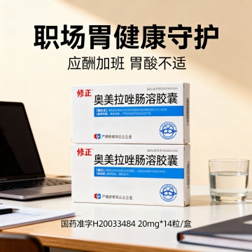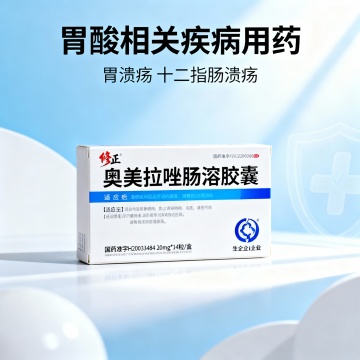 按照原图的包装设计 生成三张不同场景的修正奥美拉唑肠溶胶囊电商主图,比例1:1