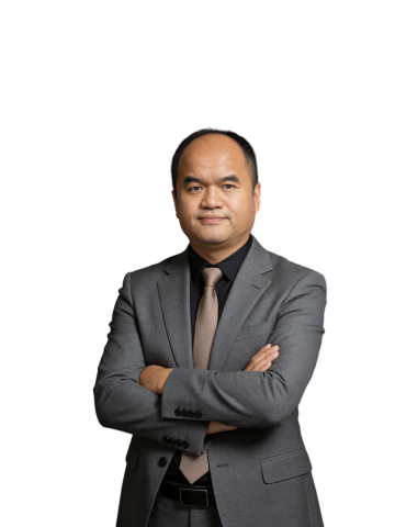 保留人物脸型、发型、年龄特征生成标准职场形象照,50MM焦段,F/4光圈(F/2.8-F/4区间),相机与人物距离3米,横向16:9比例(左右预留环境空间),人物占画面60%,入镜头部至膝盖上方5CM,平视视角,人物居中构图,头肩比例协调,身穿深墨蓝色西装,内搭白色衬衫,精致且高级的深蓝色斜向微微渐隐光泽感极细条纹商务感领带,下装黑色西裤搭配黑色皮带;正面抱胸姿态,肢体舒展的站立姿态,自信从容;主