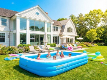 明亮的夏日别墅户外庭院场景,高清写实风格,阳光充足的自然光线:草地上一个带半透明遮阳棚的长方形充气泳池(泳池表面印满彩色卡通图案,包含字母、几何图形、小动物装饰);泳池旁的椅子上坐着一对欧美年轻父母(男士穿白色印花 T 恤 + 湖蓝色短裤,女士穿白色吊带连衣裙 + 银色高跟鞋),温柔注视孩子;背景是带露台的现代简约风别墅、翠绿平整的草坪,天空是点缀白云的晴朗蓝天,阳光明媚,天气很好。色彩鲜艳。10张