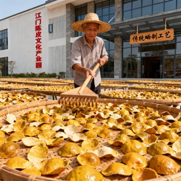 新会陈皮的制作工艺有着近千年历史传承,主要分为五步: 采收、开皮、翻皮、晒皮和陈化,其中最为重要的便是陈化。只有经过时间的沉 淀,柑皮才能成陈皮,而在新会已经有了统一的标准,陈化三年以上才能称之为 陈皮。将这些非遗工艺元素融入设计图中,能够直观地展现新会陈皮的工艺特色。 国内 AI 工具在处理设计图时,能更好地结合本地文化背景进行创作。
