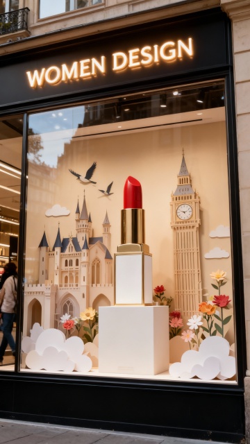梦幻感与卡通感交织,唯美插画风呈现微缩艺术场景,剪纸风建筑与浮雕式花朵环绕巨型口红,营造童话伦敦节日氛围。
