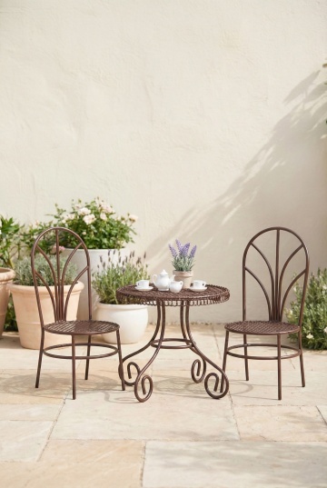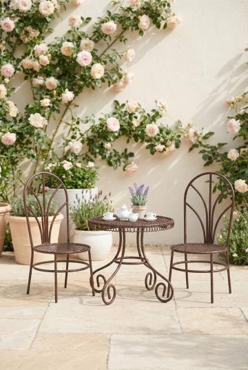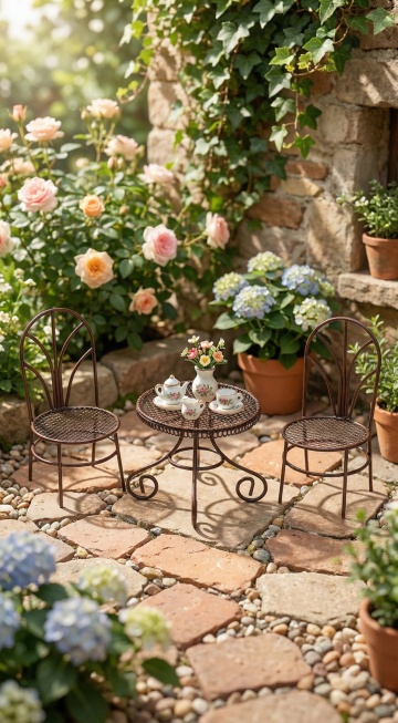 阳光明媚的花园露台餐厅,原木色方形餐桌搭配藤编靠背餐椅,桌面上摆放着白色陶瓷餐具和插满粉色玫瑰的玻璃花瓶,四周被茂密的绿植和盛开的花卉环绕,顶部悬挂着造型简约的白色布艺吊灯,地面铺设浅色防滑地砖,远处可见木质围栏和蓝天白云,整体呈现出清新自然、温馨舒适的田园风格,光线明亮柔和,营造出轻松愉悦的用餐氛围。