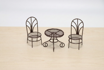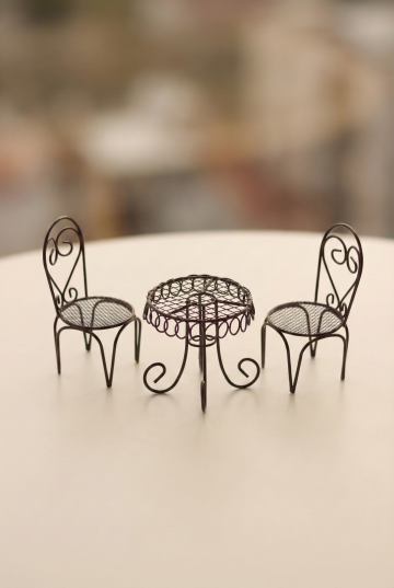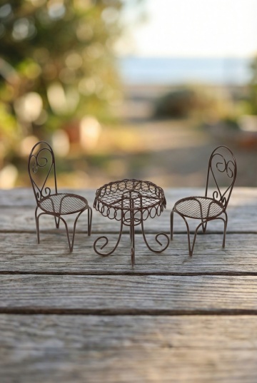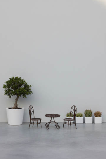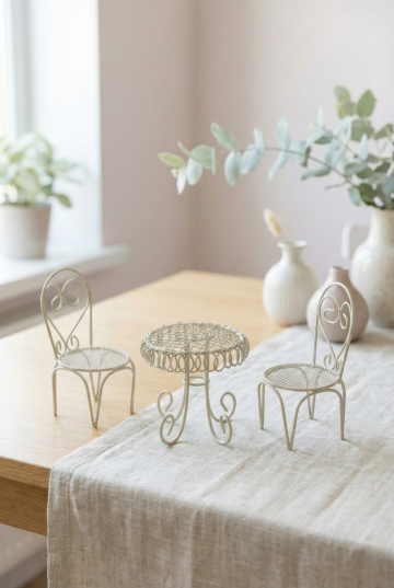 一张木质餐桌,桌面上放着一个装有白色小花的金属花盆,周围摆放着四把木质餐椅,整体呈现出温馨自然的原木风格。光线明亮柔和,从侧面窗户洒入,照亮了木纹的细腻肌理,营造出舒适惬意的氛围。