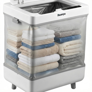 俯视角构图,极简未来主义风格的白色滚筒洗衣机悬浮于无限延伸的半透明亚克力平台中央,机身采用纳米级哑光白陶瓷材质,正面360度环绕式无边框全息观察窗正投射出流动的蓝色智能洗涤数据光效,窗沿镶嵌0.3mm超细钛合金边框形成精密的视觉分割。控制面板区域采用隐形触控技术,在通电状态下呈现冰蓝色LED虚拟按键阵列,中央旋钮带有钻石切割纹理并发出柔和的呼吸光。侧面的竖直线条采用激光雕刻的微米级凹槽,在45度侧光照射下形成精密的光影韵律。底部抽屉面板集成压力感应式开启装置,边缘倒角精确到0.5mm。环境采用4K超高清商业摄影标准布光,主光源来自左上方45度角的柔光箱,右侧配置补光灯消除阴影,背景为渐变的珍珠白到浅灰的渐变,底部铺设反光亚克力板形成微妙倒影,整体呈现出医疗级的洁净感与航天工程般的精密美学。
