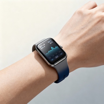 一张从正上方俯视的智能手环特写镜头,手环平放在一块温润的浅色木纹台面上。手环为曜石黑色,屏幕亮起,正展示着运动数据摘要:包括跑步图标、时长“00:45:21”、距离“5.7公里”、动态心率曲线图以及消耗的卡路里“412 kcal”。屏幕下方可见两个微小的隐藏式传感器开孔。重点在于手环的右上方,从屏幕中优雅地延伸出半透明的全息投影式数据可视化图表,图表内容为过去一周的心率趋势和睡眠阶段分析(深睡、浅睡、REM),图表设计简洁现代,以蓝绿色系为主。光线来自画面左侧的窗户自然光,在金属机身边缘形成柔和的高光,影子干净而修长。