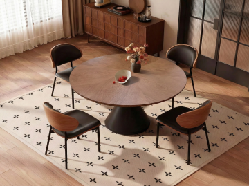 极简主义风格的餐桌背景,柔和的浅色调墙面,温暖的自然光透过窗户形成清晰的几何阴影投射在桌面上,木质餐桌表面带有细腻的木纹和自然的光影变化,左侧摆放着两个木质容器,里面整齐插着不同尺寸的木勺和金属餐具,右侧是一叠浅绿色的陶瓷盘子和一小盆新鲜的绿色植物,整体氛围宁静、温馨、充满生活气息,具有高度的3D质感和真实的材质表现,构图简洁平衡,视觉焦点明确。