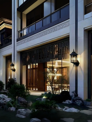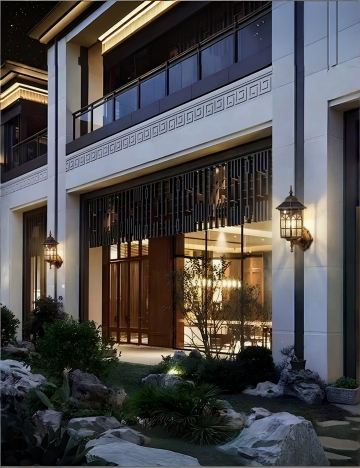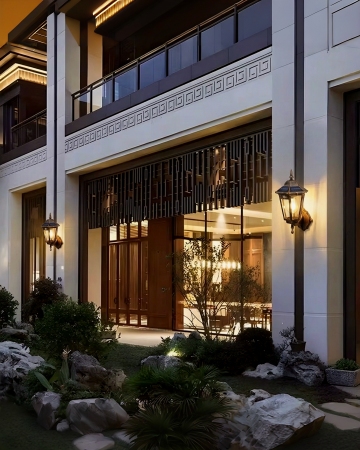 商业地产项目户外商业街黄昏透视图,现代简约建筑风格,玻璃幕墙与金属框架结构,暖黄色灯光从店铺透出,天空呈现渐变蓝紫色晚霞,点缀粉白色云朵,远处高楼林立,商业街行人悠闲漫步,店铺招牌隐约可见,地面铺设深色防滑地砖,两侧绿植盆栽点缀,整体氛围明亮通透、高端时尚,具有强烈的商业吸引力和空间纵深感,光影对比柔和,色彩和谐统一,符合商业宣传的视觉需求。