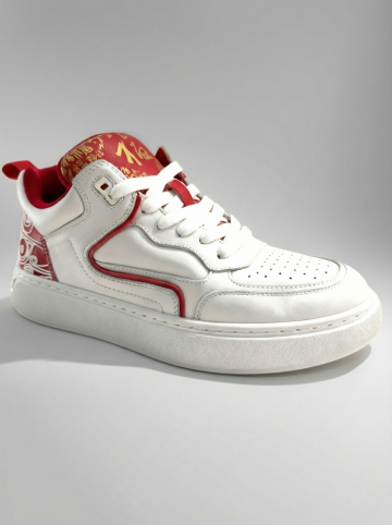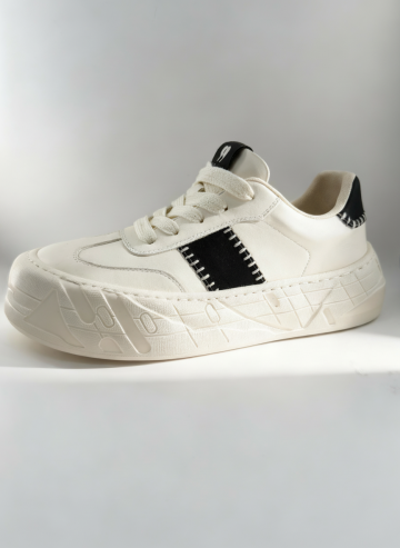 一组6款同造型运动鞋的系列素材集合,保持原图中白色为主、深蓝点缀的配色方案,规整排布在纯色背景上。每款鞋具有完全不同的材质表现:1. 光滑皮革搭配网眼布,2. 磨砂皮革与针织面料,3. 亮面漆皮结合透明PVC,4. 绒面革配反光材质,5. 牛仔布与帆布拼接,6. 金属质感漆面与橡胶。所有鞋子保持原图的复古运动鞋轮廓、波浪形线条装饰、多块拼接结构和厚实鞋底设计,光线从上方均匀照射,呈现清晰的材质纹理和轻微阴影,整体风格统一且现代。