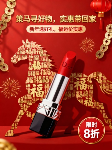 带中式棕色马头面具的模特(绣金云纹织锦外套+暗花罗纹长裤+嵌宝云头履),手持超级巨大化的朱红瓷釉口红,摆出灵动活泼的姿态,手握前方的中式立麦(麦身雕缠枝莲纹,坠流苏);场景设定在雕梁画栋的华丽戏楼舞台上,舞台搭配描金缠枝莲纹礼盒、鎏金宫灯彩球、星光纱幔和嵌宝金蛋,周围飘着赤金祥云彩带制造氛围;画面顶部巨大的3D创意变形艺术字“新年好物 马上开麦”(字体融合篆隶风格,描金勾边,嵌珍珠纹样),副标题“元启新程,华光映九州”;中国风综艺宣传海报风格,背景为绛紫织金云纹幕布+深紫暗花绒毯地面,舞台柱廊雕祥云瑞兽,角落点缀玉兰花灯,整体融入马年新春国风意象,色调华贵厚重,尽显中式典雅奢华感
