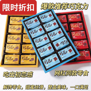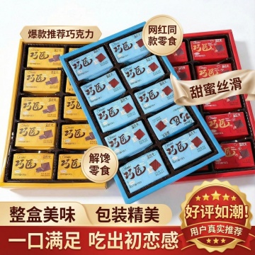 这张图片中的产品是巧克力,我在拼多多卖这款产品,以这款产品为原型帮我设计20张拼多多主图 文案要求:爆款推荐巧克力,网红同款零食,解馋零食,甜蜜丝滑,整盒美味,包装精美,一口满足,吃出初恋感