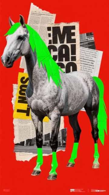 创作一幅潮流街头风的拟人化白马半身插画:主体为拟人化白马(白色皮肤,极长脖子,鬃毛是灰、白、荧光黄三色编发卷发造型),面部戴荧光黄粗框眼镜,脸颊贴绿色创可贴,颈部有黑色抽象涂鸦纹身;穿搭为荧光绿涂鸦满印西装(装饰黑白色潮流贴纸、粉色纽扣),内搭黑色褶皱衣,叠戴多层金属链条(含骷髅、几何造型吊坠);整体有轻微质感纹路,动作行为是白马呈侧头蔑视的放松姿态(半睁眼看镜头,迪士尼人物表情,微抬嘴角);场景设定为纯荧光黄高饱和背景;风格参考是 3D 潮玩拟人 + 街头涂鸦风格,兼具精致塑料质感与潮流朋克氛围;色调色彩以荧光黄、荧光绿为主,搭配黑、白、粉、绿(装饰细节);构图视角为纵向近景构图,白马占据画面核心区域;细节补充包括:鬃毛编发纹理清晰,西装涂鸦与贴纸图案丰富且层次分明,金属饰品带冷硬光泽,整体呈现潮流街头风的拟人化白马 3D 插画。