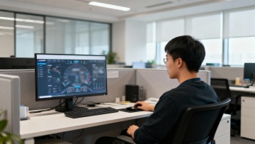 明亮现代的开放式办公室,专业商务人士正在办公桌前专注工作,配备电脑、办公文具和文件,玻璃隔断墙划分空间,白色天花板嵌入方形LED平板灯提供充足照明,灰色地毯地面,角落摆放大型绿植增添生机,整体色调以白色、灰色和蓝色为主,呈现简洁高效、专业有序的职场氛围,不同环境和角度下的办公室背景,光线明亮柔和,空间通透,办公家具现代简约,员工穿着统一深色工装,展现团队协作的工作场景。