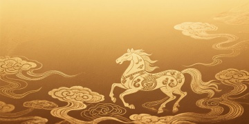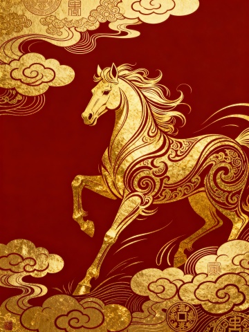 金色主色调背景,具有细腻的磨砂纹理与柔和的渐变光泽,右下角点缀闪烁的金色颗粒质感,整体呈现温暖而华丽的金属光泽感,融入中国风元素与万马奔腾的壮阔场景,马匹姿态昂扬、鬃毛飞扬,以流畅的线条勾勒出动态奔腾之势,背景可适当加入祥云纹、回纹等传统中国风装饰图案,保持整体金色调的和谐统一,营造出既具现代质感又不失古典韵味的磅礴氛围。
