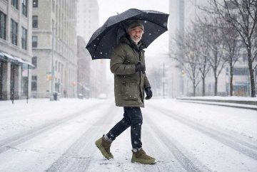 中年美国男子穿着这个鞋子,冬天在院子里面铲雪,真实摄影图