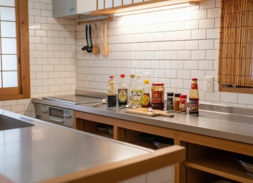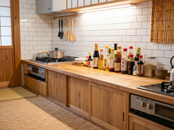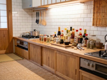 中景俯视角,在一个融合自然材质与几何美学的日式侘寂风厨房空间,浅米色硅藻泥墙面与烟熏橡木色的悬浮式橱柜形成温暖对比,台面选用带有天然冰裂纹理的火山岩材质,边缘打磨得圆润柔和。晨光透过亚麻质地的半透光障子门,在地面投下细密的木纹格栅阴影,光线呈现出柔和的米黄色调。料理台上,粗陶制成的深褐色食器套装随意摆放,旁边是一个手工编织的藤篮,里面盛放着几颗表皮粗糙的柑橘,复古铸铁茶壶正冒着袅袅热气,旁边点缀着一株小型琴叶榕盆栽,叶片上的天然虫洞更显岁月质感。开放式层架上陈列着不同釉色的粗陶碗碟,墙面悬挂着手工锻造的铁艺锅铲套装,整体构图强调材质的原始肌理与器物的自然磨损感,营造出淡泊宁静又充满生活温度的烹饪空间。