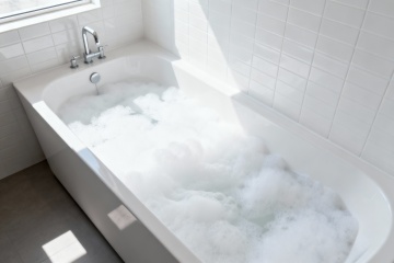 夏日泳池场景,高清晰度写实摄影风格,明亮阳光照射下的清澈蓝色池水,池壁由白色和深蓝色瓷砖铺砌,带有金属扶手的泳池阶梯部分浸入水中,水面波光粼粼并反射出耀眼的光斑,池边铺设浅棕色防滑地面,边缘点缀着色彩鲜艳的夏季花卉如粉色和黄色的绣球花,几只彩色充气游泳圈随意放置在池畔,远处可见白色遮阳伞和蓝白条纹的躺椅,营造出轻松愉快的夏日度假氛围,温暖的色调,清晰的光影对比,自然的阴影投射,整体画面充满夏日活力与清凉感。