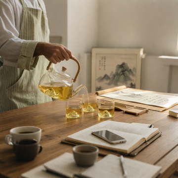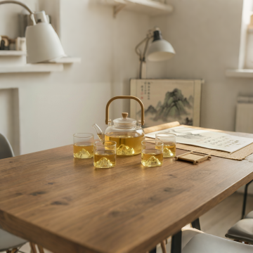 场景布置 茶具选择:挑选具有传统韵味或独特设计的茶具,如紫砂壶、青花瓷盖碗等,能增添文化氛围。 背景搭配:可以使用古朴的木质桌面、竹制垫子、书法作品或传统屏风作为背景,营造出宁静、雅致的氛围。 道具点缀:添加一些与茶相关的道具,如茶夹、茶则、茶宠、干花(如菊花、桂花)等,丰富画面元素。 光线运用 自然光:尽量选择在柔和的自然光下拍摄,如早晨或傍晚的阳光,避免强烈的直射光。