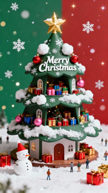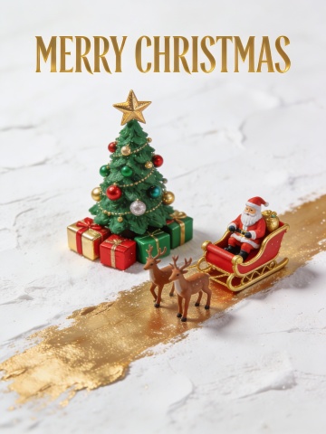 微缩艺术风圣诞场景,鎏金与金属质感交织,圣诞树与雪橇点缀温馨喜庆,梦幻感十足,节日氛围浓厚。