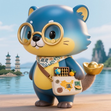 国风Q版小龙吉祥物,3D卡通风格,头大身小,头顶有小犄角,绿色鳞片带金色纹路,抱着一颗元宝,眼神笑眯眯,C4D 渲染有反光,像精致的陶瓷摆件,背景是祥云纹样