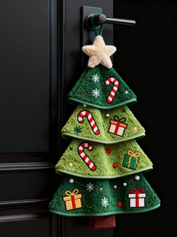 圣诞树造型擦手巾挂在门把手上,擦手巾有两层(不规则层次),树顶有毛绒星星,树身有拐杖糖,礼物盒等圣诞装饰刺绣