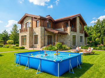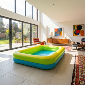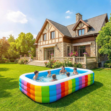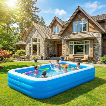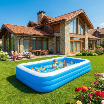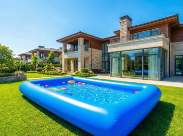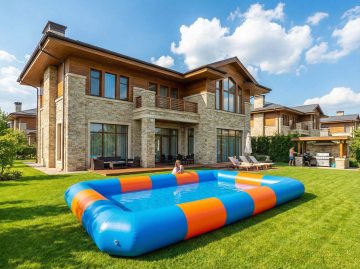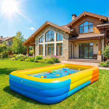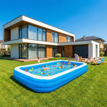 白天场景,欧美高档别墅建筑风格,户外草坪上摆放着一个长方形的充气泳池,阳光明媚,天气很好。色彩鲜艳。10张
