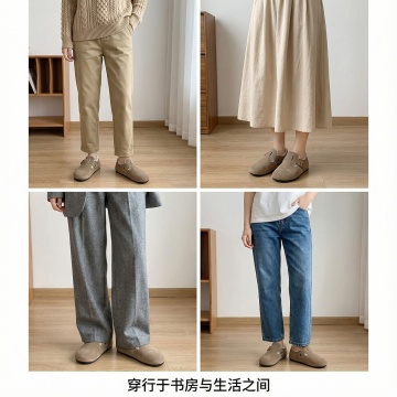 场景大图: 女模特身着米白色阔腿裤、浅蓝色棉质衬衫,外搭一件针织开衫,背着帆布包,行走在图书馆走廊或林荫道上,脚穿勃肯鞋。整体松弛、安静、有书卷气。 文案: “从书桌到咖啡馆,它是工作日最默契的伙伴。”