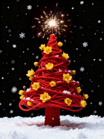 3D微缩艺术风圣诞树,红绳缠绕如毛发生长,点缀黄花与雪粒,顶燃烟花,营造梦幻温馨的节日氛围。