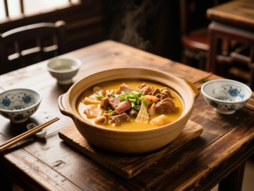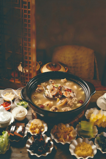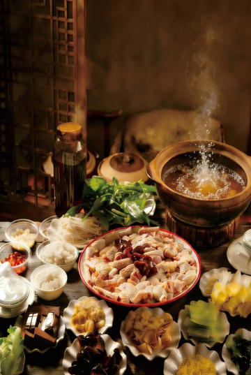 热气腾腾的鸳鸯火锅冒着浓郁香气,锅中翻滚着鲜红的麻辣汤底和清亮的菌汤,周围摆满肥牛卷、虾滑、毛肚、青菜等各色食材,木质餐桌上铺着传统花纹餐布,背景是古色古香的中式屏风和红灯笼,营造出温馨热闹的火锅盛宴氛围,整体呈现出温暖诱人的色调和丰富的层次感,充满地道的中式火锅文化气息。